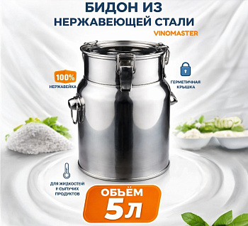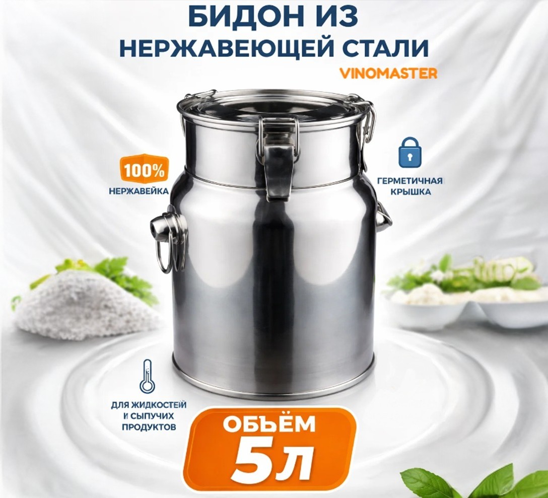 Бидон из нержавейки объемом 5 л "Виномастер" предназначен для длительного хранения пищевых жидкостей (воды, масел, соков, алкогольных напитков) и сыпучих продуктов (круп, орехов, семечек, сухофруктов). Может использоваться в качестве емкости для брожения.