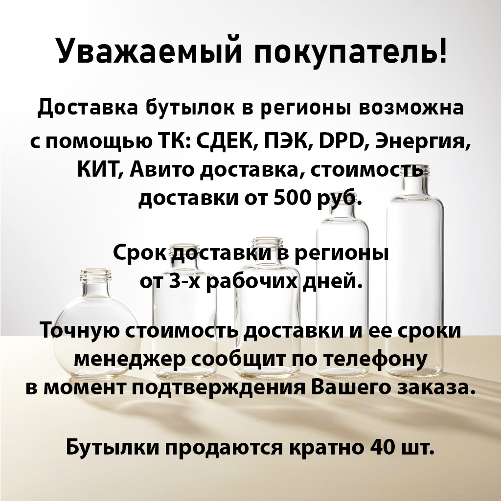 - Бутылки продаются кратно 40шт. Габариты товара (упаковка для транспортировки) - 25*25*25см, 3,2кг.