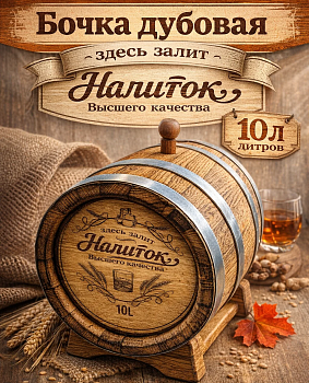 Дубовая бочка подарочная «НАПИТОК ВЫСШЕГО КАЧЕСТВА» внешний обжиг 10 л (кавказский дуб) - отличный вариант подарка на День Рождения или любой праздник. Бочка имеет привлекательный внешний вид и станет настоящим украшением праздника. Подходит для хранения и выдержки вина, самогона, виски, рома и другого крепкого алкоголя. Выполнена из кавказского скального дуба породы Quercus petraea, возраст которого не менее 80 лет. Бочка изготовлена на современном европейском оборудовании, что гарантирует идеальную геометрию бочки и качественную ее обработку.