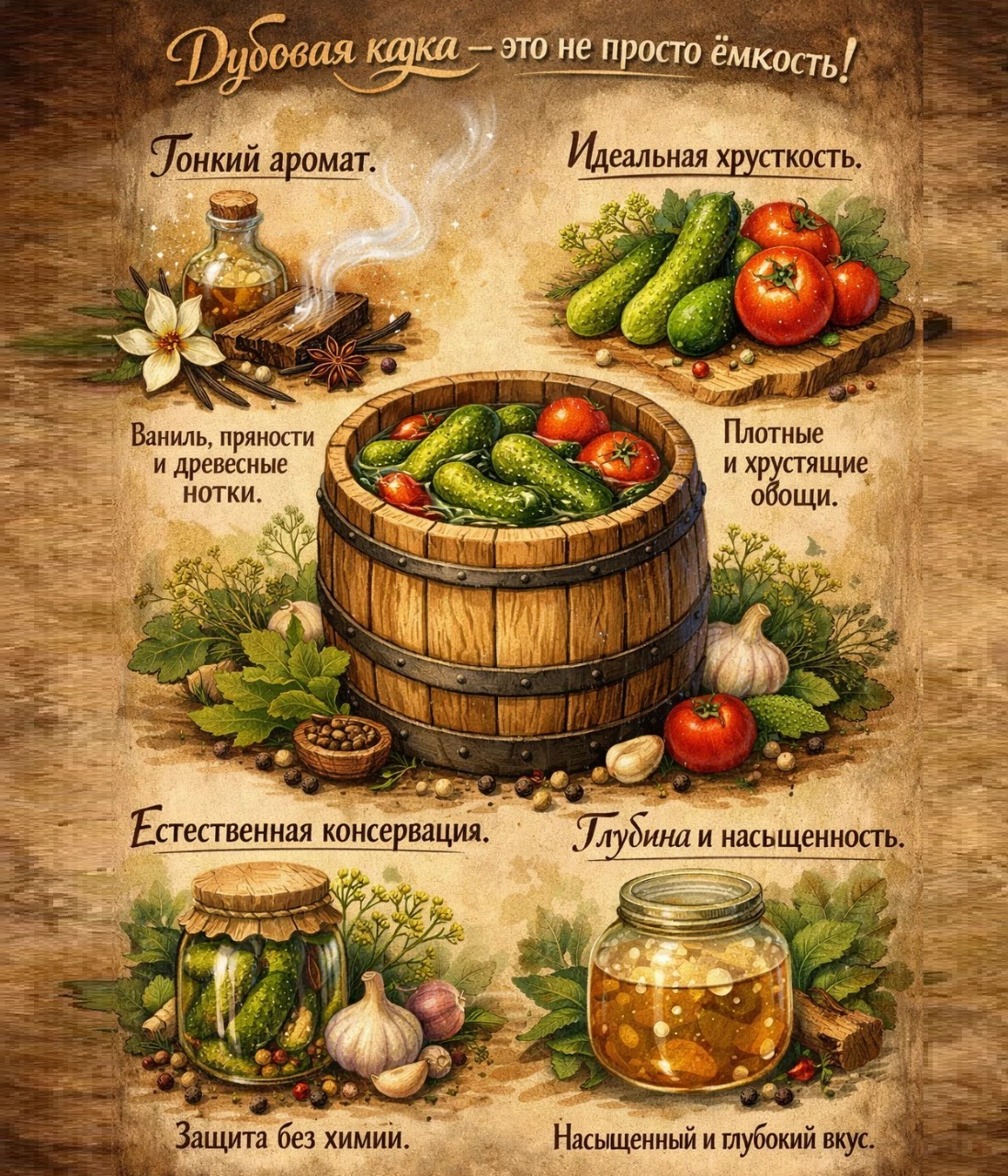 - В деревянной кадке соления приобретают неповторимый, уникальный вкус, которого нельзя добиться в стеклянной или эмалированной посуде.