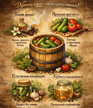 - Древесина дуба способствуют сохранению вкуса, цвета, запаха и свежести продуктов.