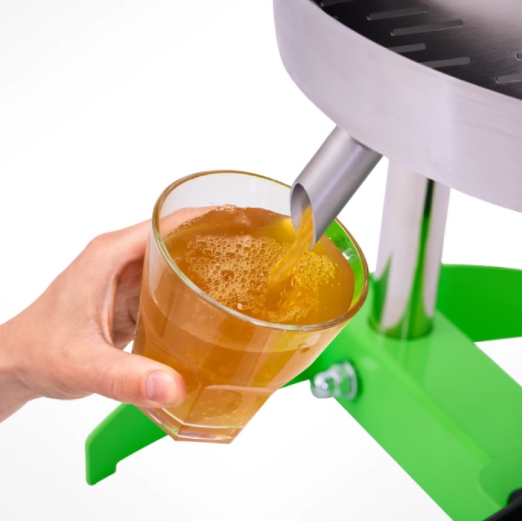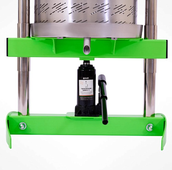 - Домкрат упирается в основание и толкает его вверх. Таким образом фрукты внутри корзины сжимаются между основанием и прижимной пластиной, и происходит отжим сока.